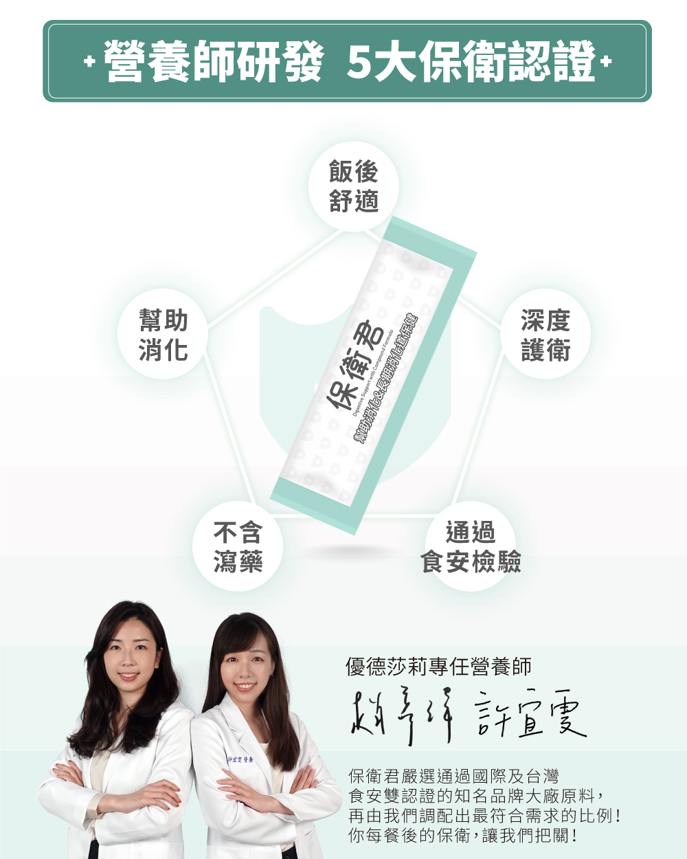 趙亭瑋營養師花了半年的時間研究各種成分,最後嚴選5種成分組成保衛配方,飯後一包即時攝取Gastro-AD®德氏乳桿菌、DigeZyme®綜合消化酵素,幫助消化。同時也會攝取到麩醯胺酸、花椰菜苗抽取物(含蘿蔔硫素)、高麗菜發酵粉(含天然維生素U),無憂保衛!
