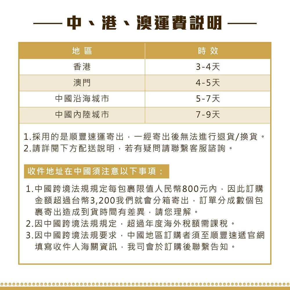 ◉ 中國跨境法規規定每包裹限值人民幣800元內,因此訂購金額超過台幣3,000我們就會分箱寄出,訂單分成數個包裹寄出造成到貨時間有差異,請您理解。