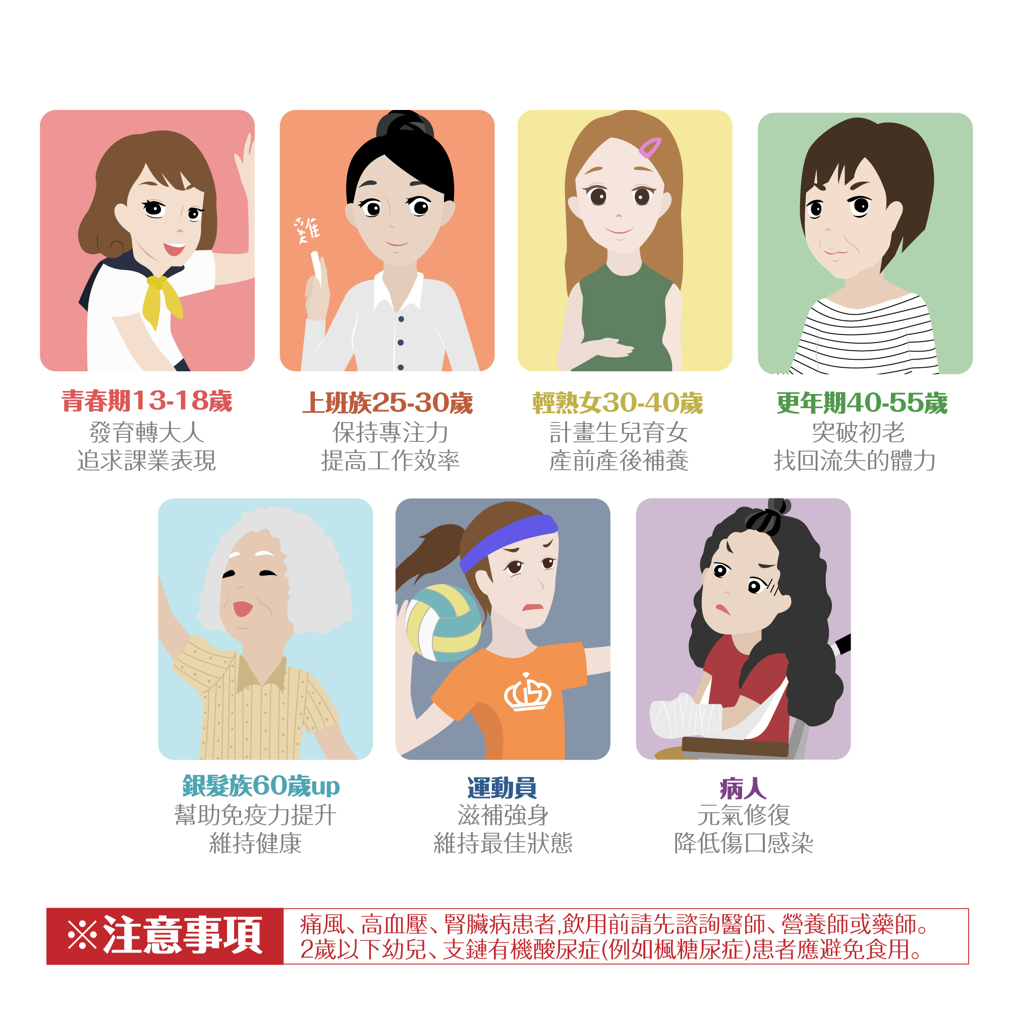 ※ 注意事項:痛風、高血壓、腎臟病患者,飲用前請先諮詢醫師、營養師或藥師。2歲以下幼兒、支鏈有機酸尿症(例如楓糖尿症)患者應避免食用。